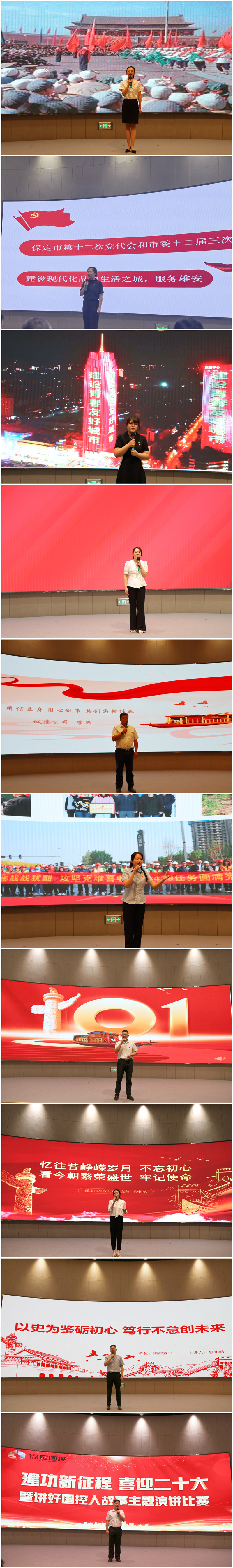 來自集團部室、各子公司的十名選手緊貼工作實際,結(jié)合所思所悟,以飽滿真摯的情感、平實生動的語言講述著黨的光榮歷史和身邊的動人事跡,表達了在“激情奮進十四五、再造一個新保定”號召下國控人為現(xiàn)代化品質(zhì)生活之城建設(shè)賦能的信心與決心。從集團成立之初的艱辛探索到相繼承接保定市系列重點建設(shè)項目,從“市委有號令、政府有部署、國控見行動”的無畏擔(dān)當(dāng)?shù)健芭c時間比進度、與機遇搶速度、與困難拼力度”的拼搏付出,國控六年的成長與新時代保定的發(fā)展如影隨形,國控六年的創(chuàng)業(yè)史就是全體黨員職工的奮斗史,他們或是攻堅在項目一線,凝心聚力、日夜鏖戰(zhàn),用實際行動踐行著“綻放新顏值、跑出加速度”的國企使命;或是以執(zhí)著的敬業(yè)精神、過硬的專業(yè)素質(zhì),日復(fù)一日在平凡崗位上書寫著合格國控人的精彩篇章。一個個鮮活的事例和身邊故事傳遞著愛黨愛企愛崗的正能量,深深感染了在場的每一位員工,贏得了評委、觀眾們的掌聲和共鳴。