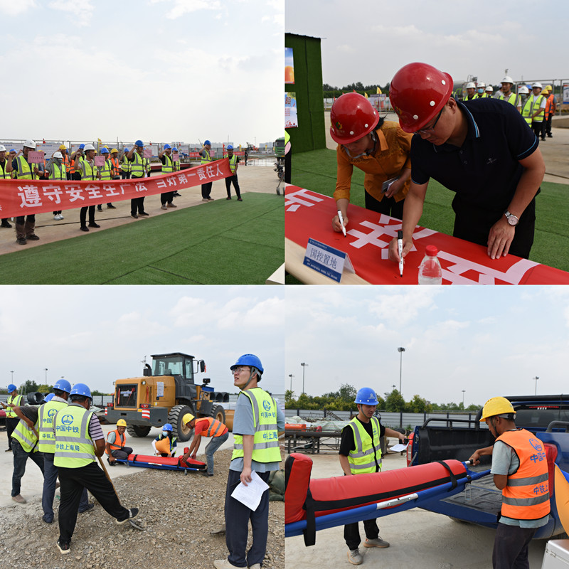 本次演練共設置基坑坍塌、消防安全、防汛救災應急演練3個項目,按照險情發現和上報、險情搶救、人員救治、險情解除等環節進行,分設后勤保障組、搶險救援組、醫療救護組、警戒保衛組、疏散引導組等五個專業組。下午15:00,演練拉開序幕,全體人員進行了安全宣誓,并在橫幅上鄭重簽下自己的名字。隨后,情景模擬依次展開。